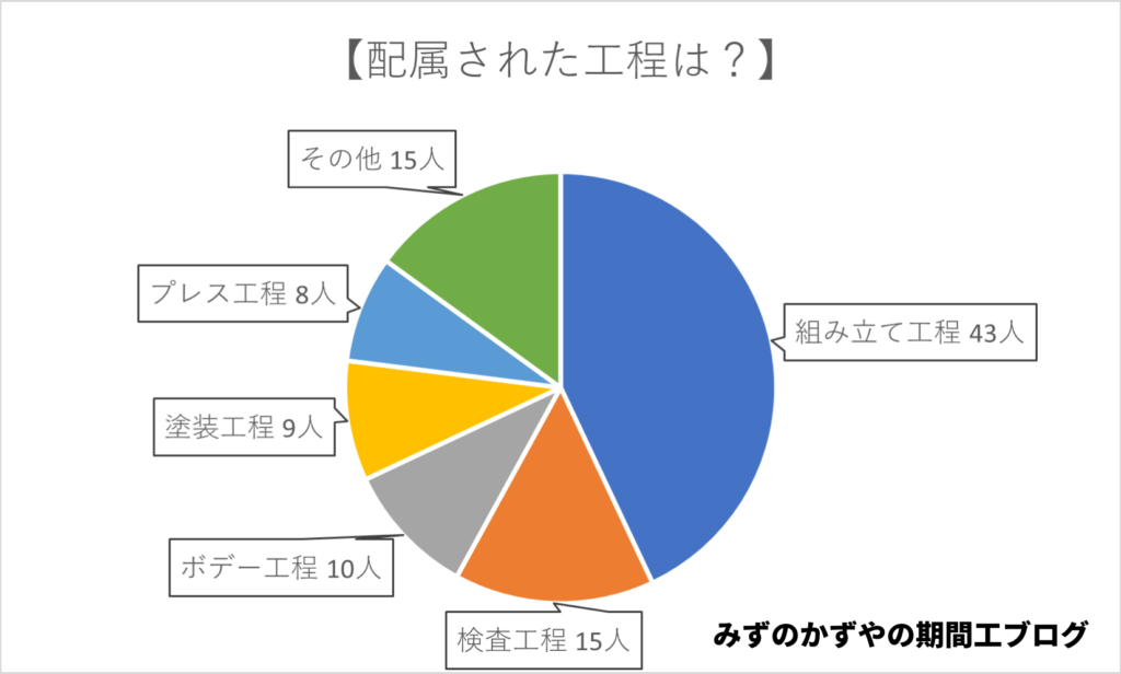 組み立て工程に配属される割合がダントツ(約4割以上)でした。配属される工程は工場や会社によってさまざまですが、数にすると全100〜1000種類以上もあるんですよね。